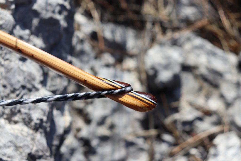 La poignée légèrement Pistol est un assemblage complexe en Double-demi Lune de Palissandre des Indes et d’If avec insertion de Marqueterie