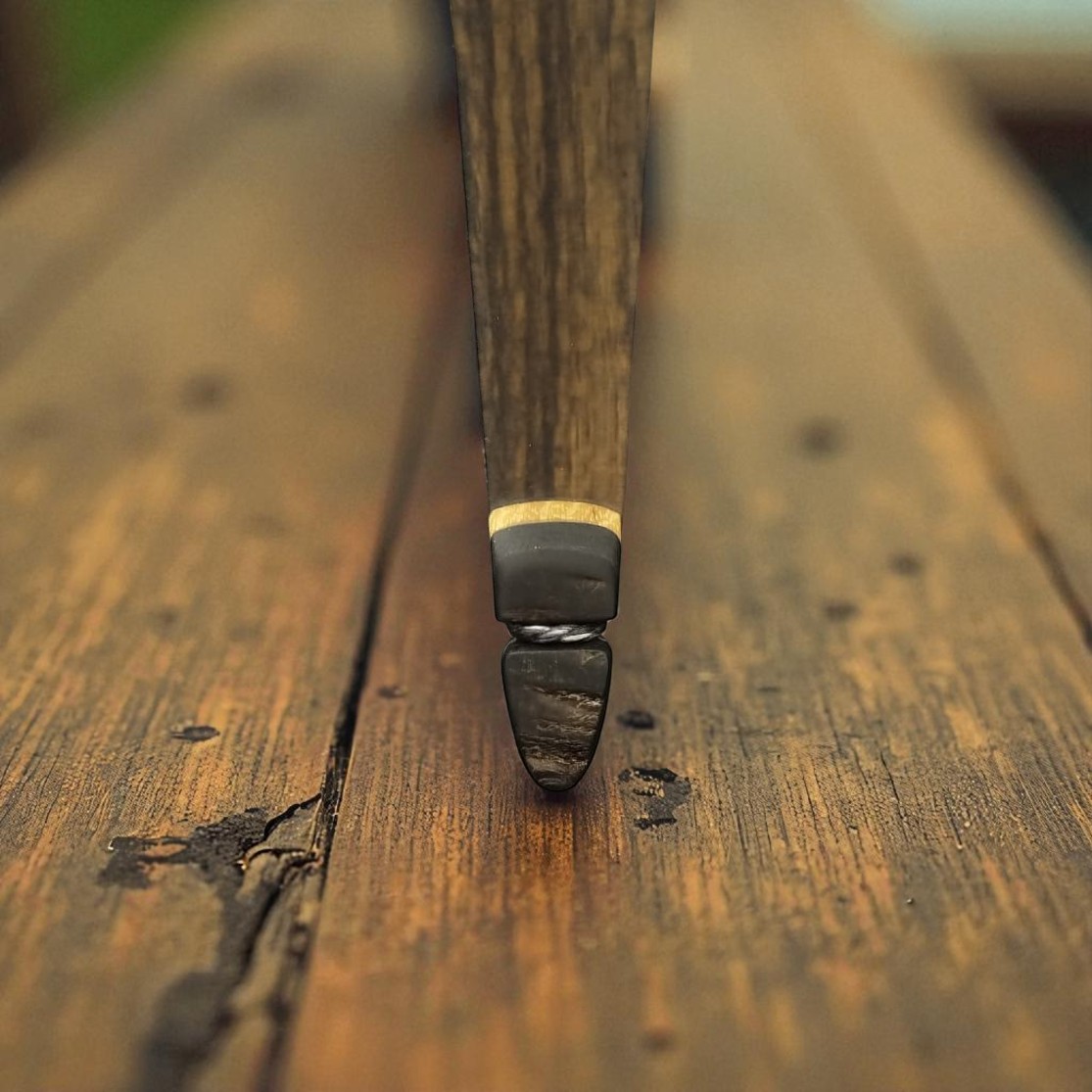 Poignée légèrement « Dished » et ovale en Buis Echauffé avec des insertions de fibres noires et blanches, d’If et d’Ebène de Macassar. Les renforts de poupées sont en fibres noires et blanches et de la Corne de Buffle Naturelle. La fenêtre est centrée à + 2 mm. La corde est de type flamande en Astro Flight. Sa puissance est de 45# pour une allonge de 26″.