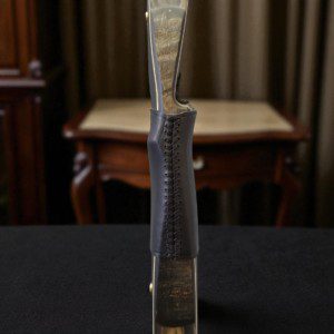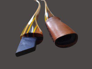 Les poignées sont œuvrées dans des bois denses et précieux tels que l’Ebène, le Ziricote, le Bois de Rose, le Bocote et autres Palissandres bien que je cherche de plus en plus à trouver des alternatives à ces bois en voie de disparition.