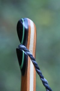 Les renforts de poupées reprennent la composition de la poignée. La corde est en Astroflight avec deux pompons en Vison. Cet arc puissant, rapide et confortable pèse 45# à 28″ d’allonge. Le vernis particulièrement brillant met parfaitement en valeur les veines de ces belles essences indigènes.
