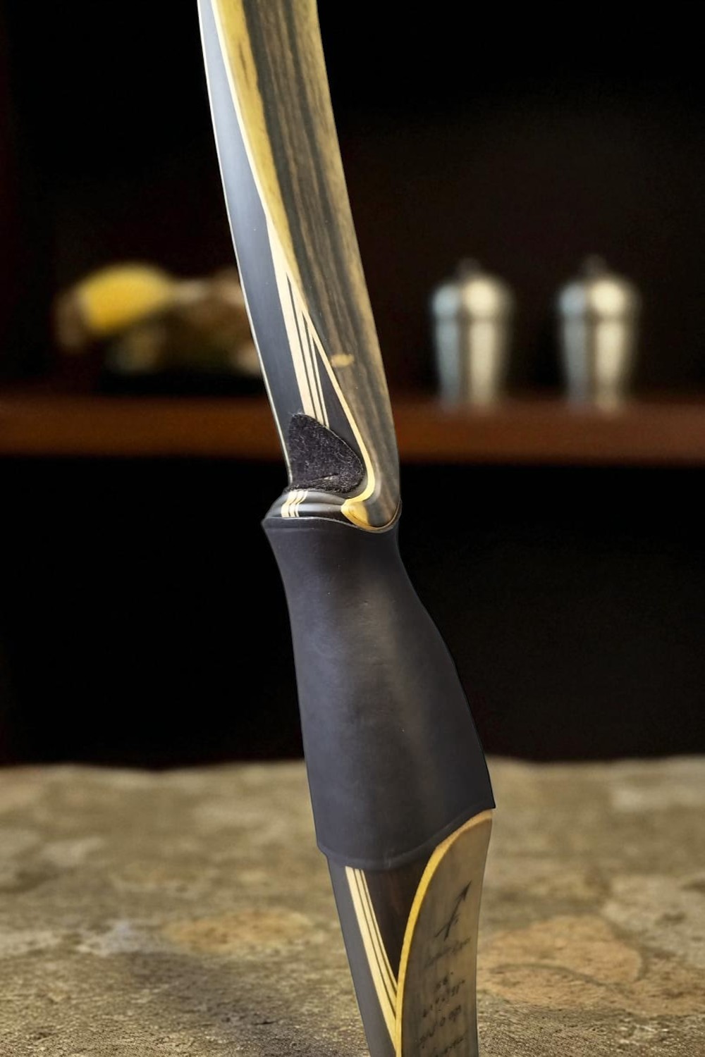 Poignée légèrement ergonomique (Pistol) en Ebène de Macassar veiné avec un arceau de fibres noires et jaunes. Les renforts de poupées sont en fibres de carbone, fibres jaunes et Ebène de Macassar. La fenêtre est centrée à + 2 mm. La corde est de type flamande en Fast Flight. Sa puissance est de 55.40# pour une allonge de 30.50″.