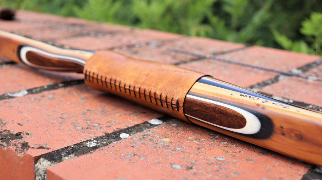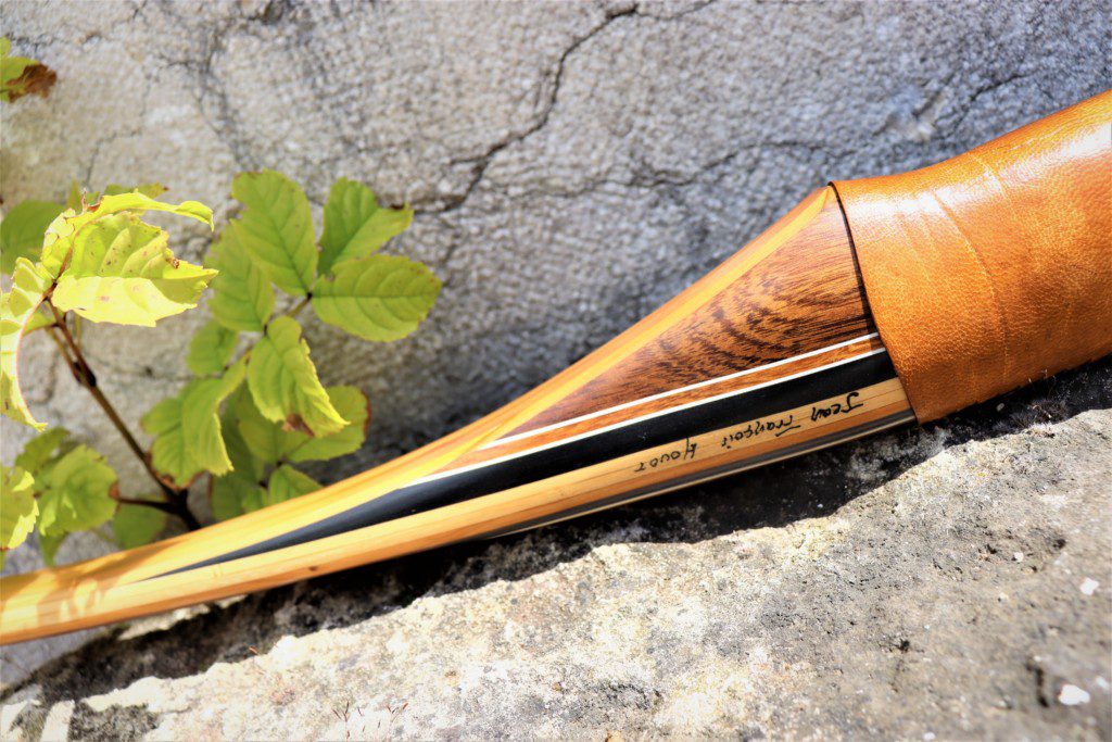 La poignée légèrement « Pistol » est œuvrée dans un magnifique carrelet de Bois de Fer d’Arizona, elle est renforcée par un arceau de fibres noires et d’une lamelle de Bois de Fer cernée par 2 fibres blanches