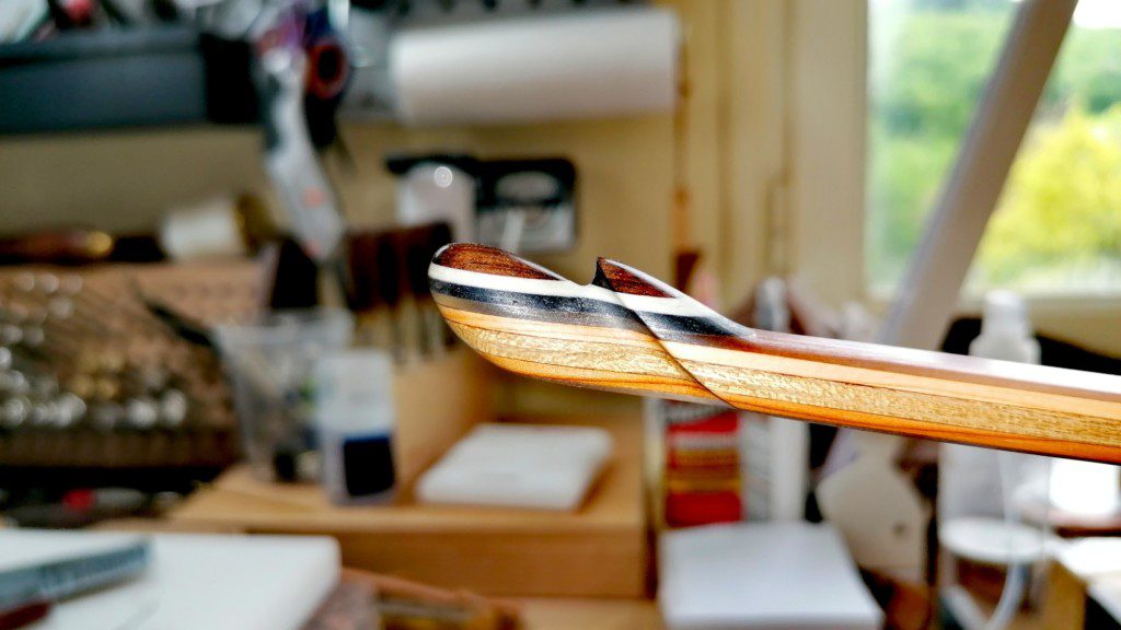 Il est composé d’Ebène de Macassar, de Viel Olivier cerné de fibres Blanches et Noires pour la poignée et d’If des Montagnes Jurassiennes ainsi que du Cytise Alpin pour les branches