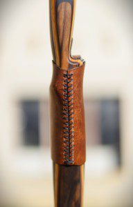 La poignée ergonomique est un assemblage de Noyer du Périgord que j’ai stabilisé pour lui donner « un peu » de masse, elle est renforcée est alourdie par un arceau de composite G10 et de fibres marron ainsi qu’une insertion longitudinale interne de G10
