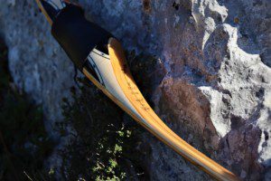 La poignée ergonomique est un assemblage en double demi-lune d’Ebène du Gabon et d’Erable Sycomore Ondé, les demi-lunes sont séparées par de la Marqueterie composée elle même d’Ebène du Gabon, d’Erable Sycomore et de fibres blanches et noires